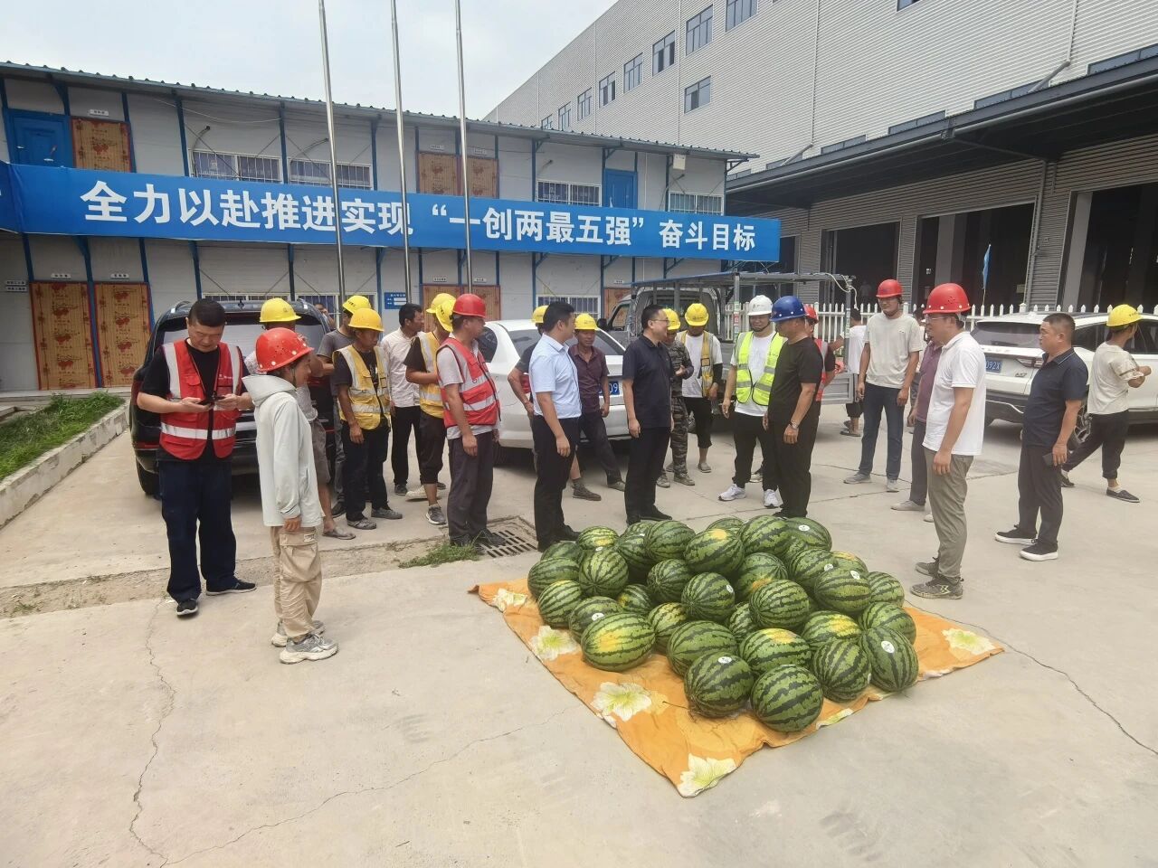 7月8日上午,市場(chǎng)投資公司副總經(jīng)理張航旗、總經(jīng)理助理胡占濤一行前往騰達(dá)項(xiàng)目施工現(xiàn)場(chǎng),慰問(wèn)酷暑作業(yè)中的一線工人并開(kāi)展項(xiàng)目查看工作,為他們送去西瓜等清涼物資,并就項(xiàng)目建設(shè)問(wèn)題進(jìn)行了交流。